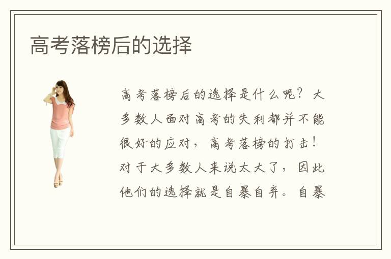 高考落榜后的選擇是什么呢?大多數(shù)人面對高考的失利都并不能很好的應(yīng)對,高考落榜的打擊!對于大多數(shù)人來說太大了,因此他們的選擇就是自暴自棄。自暴自棄的后果就是逐漸迷失自我,要想未來的生活質(zhì)量能夠得到提升就需要做出相應(yīng)的努力,首先要做的就是要調(diào)整好自己的心態(tài),要走出高考落榜失敗的陰影,選擇一門比較適合自己并且具有廣闊發(fā)展前景的專業(yè)課程進(jìn)行努力學(xué)習(xí)。