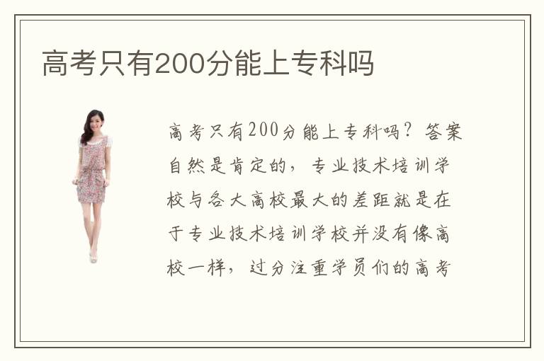高考只有200分能上專科嗎?答案自然是肯定的,專業(yè)技術(shù)培訓(xùn)學(xué)校與各大高校最大的差距就是在于專業(yè)技術(shù)培訓(xùn)學(xué)校并沒有像高校一樣,過分注重學(xué)員們的高考成績,也并沒有像高校一樣設(shè)置一系列入學(xué)門檻。專業(yè)技術(shù)培訓(xùn)學(xué)校比較注重的是對于學(xué)員們的專業(yè)技術(shù)培訓(xùn),因此高考只有200分是能上專科的。最重要當(dāng)然還是要靠學(xué)員自己的學(xué)習(xí)能力,以及是否具備學(xué)習(xí)下去的動力。