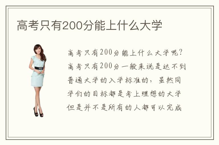 高考只有200分能上什么大學(xué)呢?高考只有200分一般來(lái)說(shuō)是達(dá)不到普通大學(xué)的入學(xué)標(biāo)準(zhǔn)的,雖然同學(xué)們的目標(biāo)都是考上理想的大學(xué)但是并不是所有的人都可以完成的,當(dāng)然考不上大學(xué)的同學(xué)不要?dú)怵H,因?yàn)檫€有另一條道路是適合你們的。國(guó)內(nèi)各地都開(kāi)始了很多大專就是培訓(xùn)學(xué)校,這些教育機(jī)構(gòu)作是以專業(yè)教學(xué)為重點(diǎn)的,并不是很看重學(xué)員們的入學(xué)成績(jī),因此高考只有200分可以去考慮這些大專技術(shù)學(xué)院。