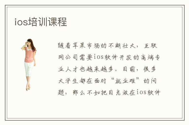 隨著蘋果市場的不斷壯大,互聯(lián)網(wǎng)公司需要ios軟件開發(fā)的高端專業(yè)人才也越來越多。目前,很多大學(xué)生都在面對(duì)“就業(yè)難”的問題,那么不如把目光放在ios軟件開發(fā)上,各大企業(yè)對(duì)于這一方面的人才都很緊缺。學(xué)習(xí)ios就要選擇一家權(quán)威的ios培訓(xùn)機(jī)構(gòu)去學(xué)習(xí),那么,ios培訓(xùn)課程會(huì)開設(shè)哪些課程呢?一般都會(huì)從基礎(chǔ)課程開始學(xué)習(xí),循序漸進(jìn),才能把技能學(xué)的扎實(shí)。