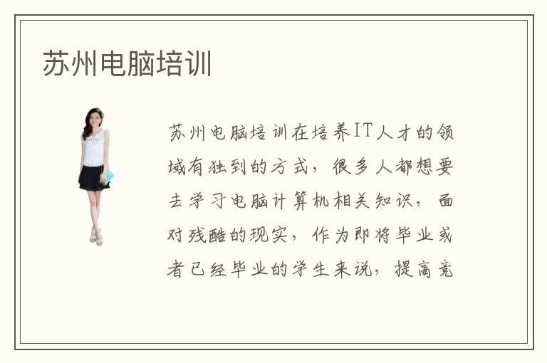 蘇州電腦培訓在培養(yǎng)IT人才的領域有獨到的方式,很多人都想要去學習電腦計算機相關知識,面對殘酷的現(xiàn)實,作為即將畢業(yè)或者已經(jīng)畢業(yè)的學生來說,提高競爭實力不容置疑也迫在眉睫,蘇州電腦培訓班成立已經(jīng)多少有些時間了,所以相關的教學經(jīng)驗還是不錯的 蘇州電腦培訓學校學生的就業(yè)率有保證嗎?蘇州電腦培訓學校辦學理念到底是什么呢?