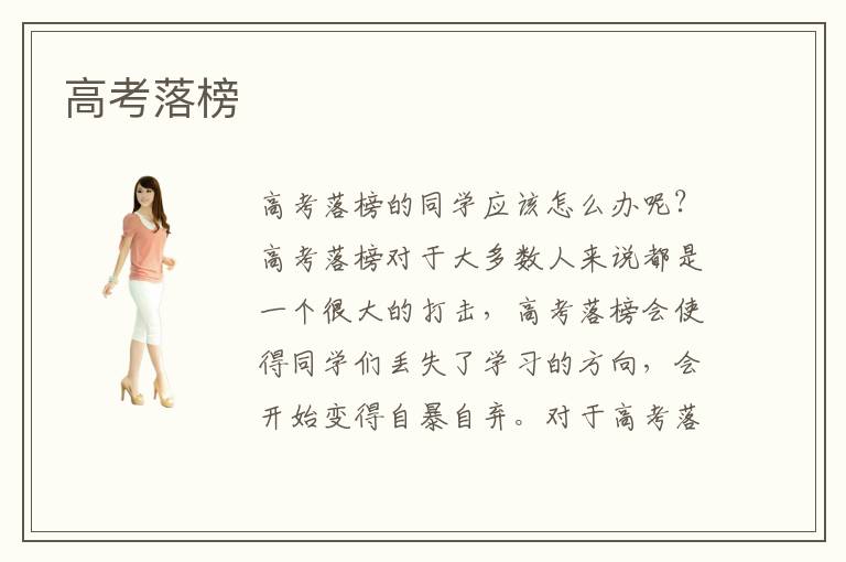 高考落榜對于高三考生們將會是一個巨大的打擊,當考生們把美好未來的所有希望都寄托在高考上,由于高考過程中的失利,可能會導(dǎo)致他們對于未來失去信心、迷失了未來的方向,變得自暴自棄起來。那么,高考落榜應(yīng)該怎么辦呢?高考落榜最重要的一點就是要學會調(diào)整好自己的心態(tài),要觀察了解社會發(fā)展的就業(yè)趨勢,找到一門適合自己學習并且具有發(fā)展?jié)摿Φ膶I(yè),并且努力學好它。
