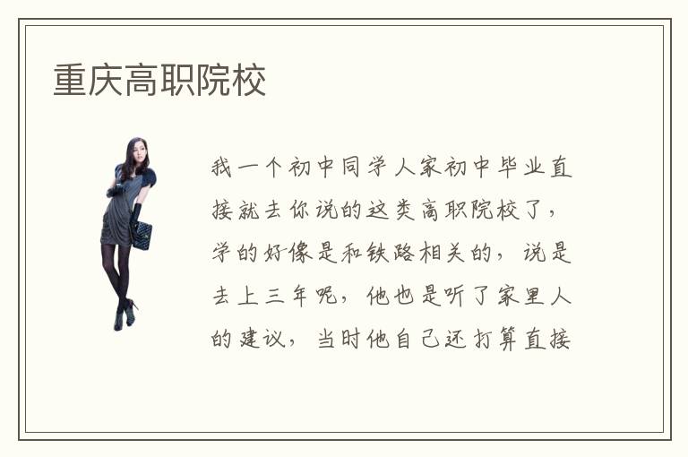 我一個初中同學人家初中畢業(yè)直接就去你說的這類高職院校了,學的好像是和鐵路相關的,說是去上三年呢,他也是聽了家里人的建議,當時他自己還打算直接去打工呢,現(xiàn)在已經畢業(yè)上班了,心里還是很感激當時的決定的,至少現(xiàn)在薪資待遇還不錯,所以如果你打算去學一門技術,可以考慮重慶高職院校啊,也是看你選擇哪一個專業(yè)呢,有的學校名氣一般般,專業(yè)還是可以的 ,你完全可以根據(jù)專業(yè)選擇學校的,如果問靠譜的重慶高職院校,怎么說呢,現(xiàn)在網上信息魚龍混雜的,誰也不知道哪一個是真實的,所以最好去實際看看學校怎么樣,至少可以了解學內環(huán)境基礎設施啊,至于教師教學水平怎么樣,直接去試聽一下他們課程,親自感受一下怎么樣,重慶高職院校課程內容一般都有介紹的,完全是根據(jù)你選擇好的專業(yè)開設的,如果有時間可以問一下,學校咨詢處就可以回答你