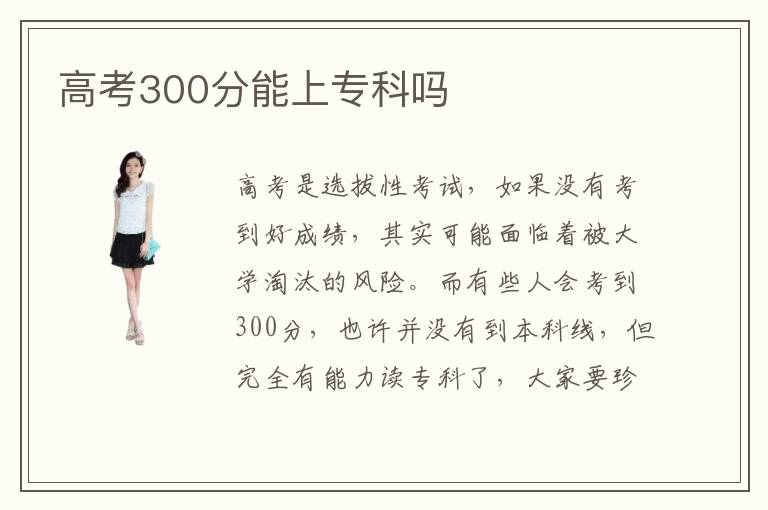 高考是選拔性考試,如果沒有考到好成績,其實可能面臨著被大學(xué)淘汰的風(fēng)險。而有些人會考到300分,也許并沒有到本科線,但完全有能力讀??屏?,大家要珍惜機會,不要認為善的分很低,可以選擇一些比較好的???。高考300分能上??茊崮懿荒軌蝰R上找工作,300分上??埔彩强梢缘?,但不要馬上找工作,因為找工作沒有任何優(yōu)勢。剛高中畢業(yè),就算發(fā)展的再好,未來必然會被他人取代。高考300分能上專科嗎??朴心男﹥?yōu)點,高考300分一般都是比較劣勢了,如果能上大專的話,要考慮清楚不同大專的專業(yè)排名,而有些人會比較務(wù)實,選擇企業(yè)需求比較熱門的專業(yè),包括電子計算機以及網(wǎng)絡(luò)科技應(yīng)用等等?,F(xiàn)在確實有很多學(xué)校都能提供這些專業(yè),還是要區(qū)分清楚不同專業(yè)的差異性,不要盲目判斷。