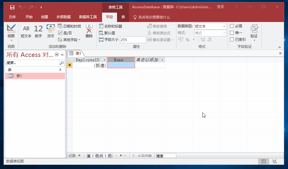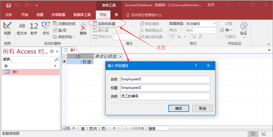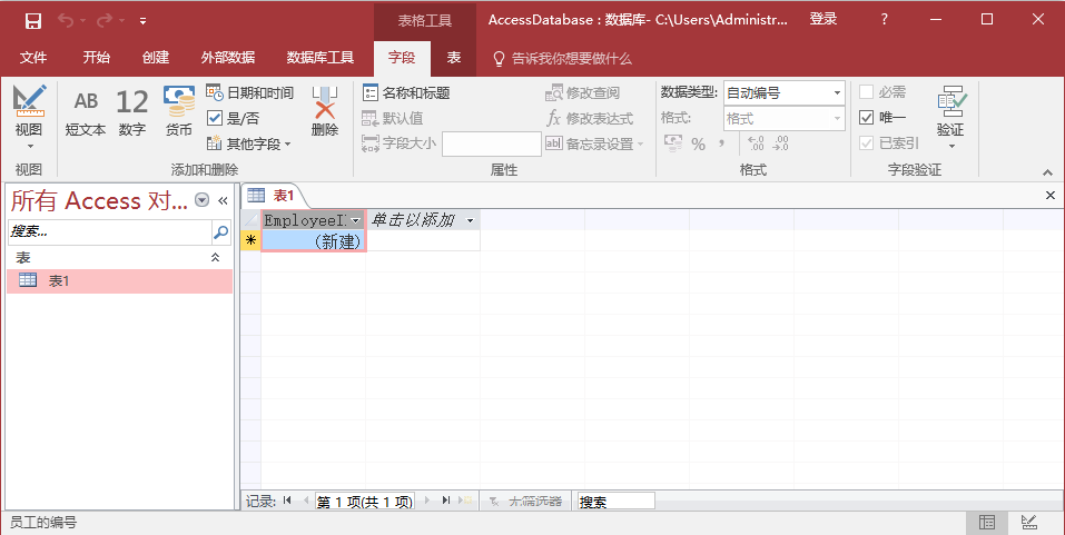 在“表名稱”字段中輸入表的名稱:Employee 后。點(diǎn)擊確定,將在導(dǎo)航窗格中看到您創(chuàng)建的表名稱。