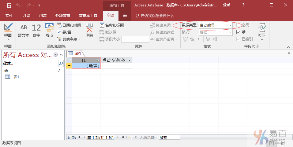 現(xiàn)在轉(zhuǎn)到“字段”選項(xiàng)卡,看到ID字段是自動(dòng)創(chuàng)建的。ID字段使用自動(dòng)編號(hào)充當(dāng)?shù)奈ㄒ粯?biāo)識(shí)符,并且是該表的主鍵。