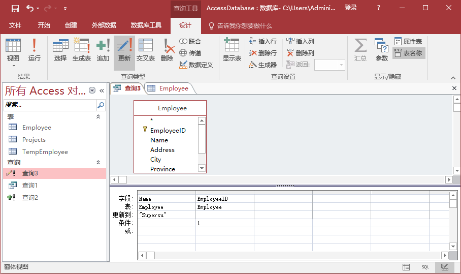 在“設(shè)計(jì)”選項(xiàng)卡的“查詢類型”組中,單擊“更新”并雙擊要更新值的字段。假設(shè)要將員工編號為:"1"的名字更新為"Supersu"。如下圖所示 -