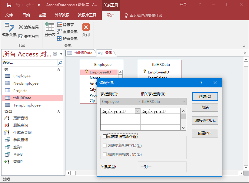 以上窗口將Employees的EmployeeID字段與tblHRData的EmployeeID關(guān)聯(lián)起來(lái)。 現(xiàn)在點(diǎn)擊 創(chuàng)建 按鈕,現(xiàn)在這兩個(gè)表就創(chuàng)建了相關(guān)聯(lián)關(guān)系了。如下圖所示 -