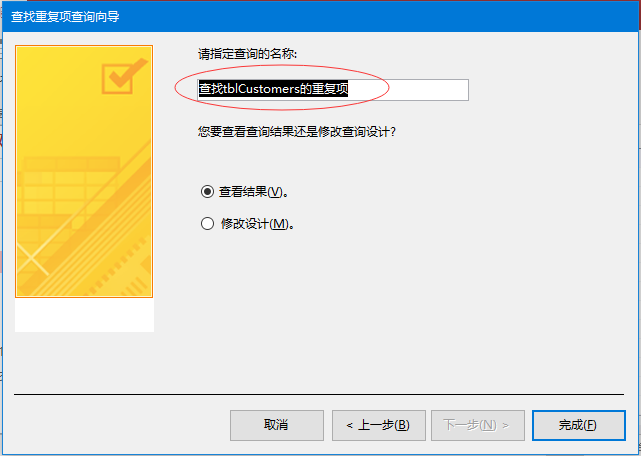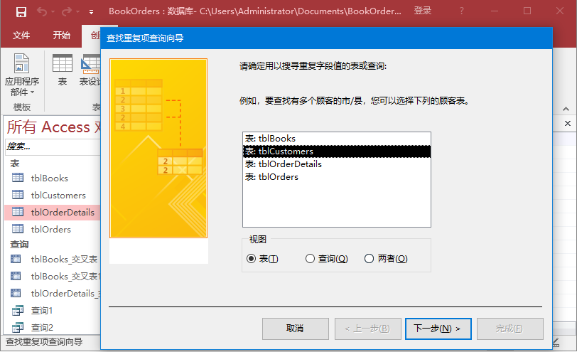 查找重復(fù)查詢向?qū)?/strong>的第一個屏幕將詢問您要搜索哪個表或哪個查詢可能有重復(fù)。假設(shè)要檢查tblCustomers表,以確保同一客戶沒有輸入兩次或多次。 所以,選擇tblCustomers并點(diǎn)擊下一步。