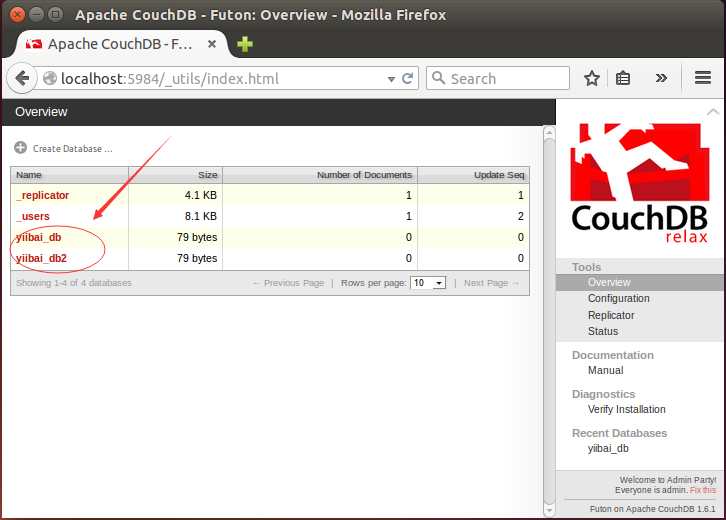 yiibai@ubuntu:~$ curl -X GET http://localhost:5984/_all_dbs