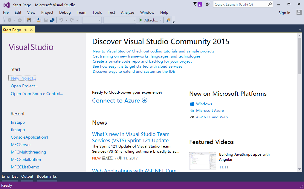 注意:在編寫本教程文章時(shí),為了方便,我使用的是之前安裝的 VS2015 ,它與 VS2017 差別不大,所以就不重新安裝了。