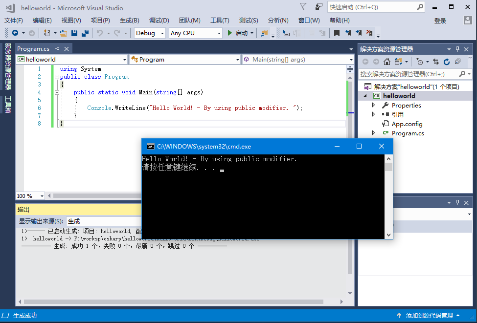 Console.WriteLine("Hello World! - By using public modifier. ");