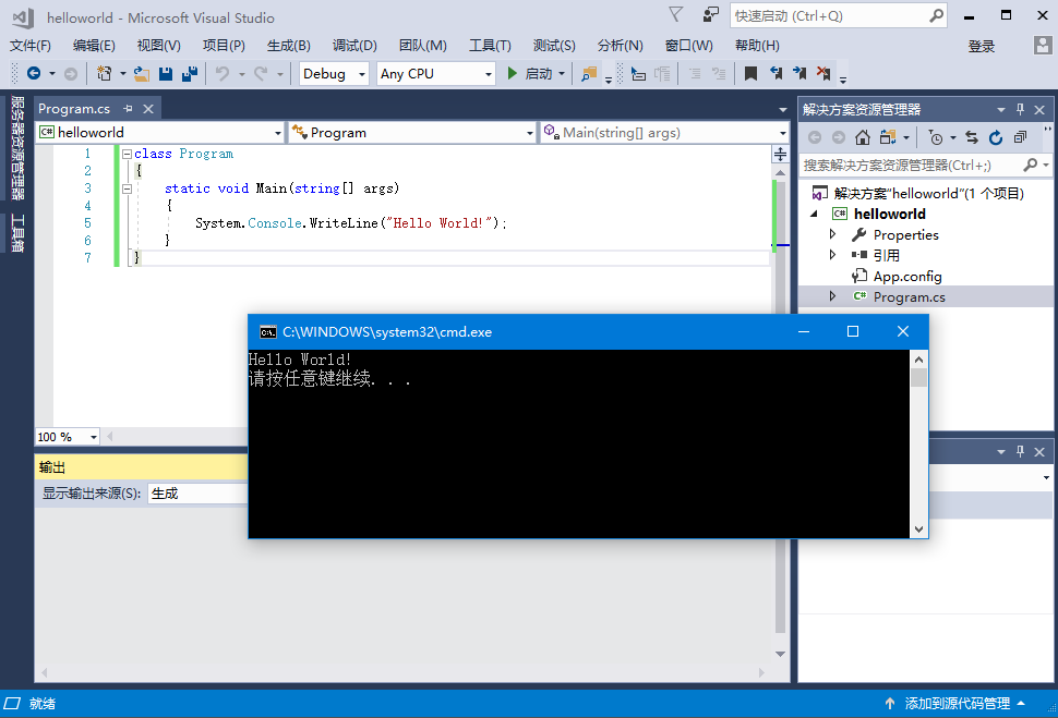 點(diǎn)擊頂上的主菜單:調(diào)試(D) -> 開始執(zhí)行(不調(diào)試),執(zhí)行編譯并運(yùn)行得到以下結(jié)果 -