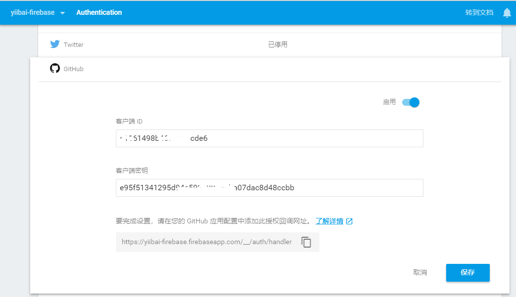 按照此鏈接創(chuàng)建GitHub應(yīng)用程序。 需要將Firebase中的回調(diào)網(wǎng)址復(fù)制到授權(quán)回調(diào)網(wǎng)址字段中。 創(chuàng)建應(yīng)用程序后,需要將客戶端密鑰和客戶端密鑰從GitHub應(yīng)用復(fù)制到Firebase。