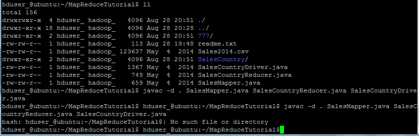 hduser_@ubuntu:~/MapReduceTutorial$ javac -d . SalesMapper.java SalesCountryReducer.java SalesCountryDriver.java