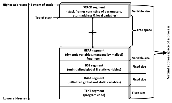 堆棧段是分配給自動(dòng)變量和功能參數(shù)的內(nèi)存區(qū)域。 它還在執(zhí)行函數(shù)調(diào)用時(shí)存儲(chǔ)返回地址。 堆棧使用LIFO(后進(jìn)先出)機(jī)制存儲(chǔ)本地或自動(dòng)變量,函數(shù)參數(shù)和存儲(chǔ)下一個(gè)地址或返回地址。 返回地址是指函數(shù)執(zhí)行完成后返回的地址。 該段大小根據(jù)局部變量,函數(shù)參數(shù)和函數(shù)調(diào)用而變化。 該分部從較高的地址增長(zhǎng)到較低的地址。