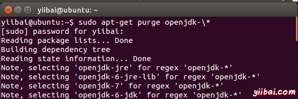 yiibai@ubuntu:~$ sudo apt-get purge openjdk-\*