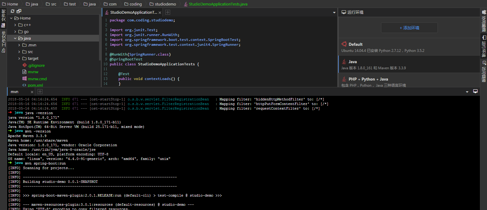 "Java"mvn spring-boot:run 啟動(dòng)服務(wù)(首次啟動(dòng)由于需要下載依賴包、可能需要一些時(shí)間)Tips: 從終端中輸入命令可以看出 CloudStudio 為我們集成了 Ubuntu16.04 + java1.8+Apache Maven3.3.9 的開發(fā)環(huán)境: