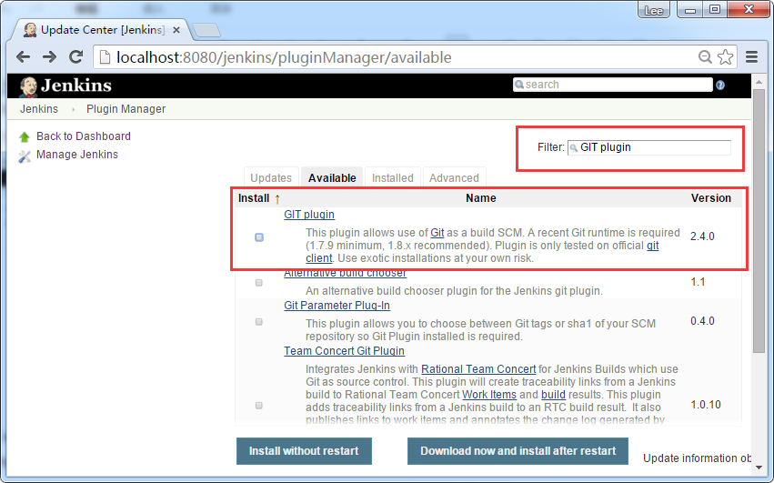 在接下來(lái)的屏幕中,單擊 Available 選項(xiàng)卡。這個(gè)標(biāo)簽將顯示可供下載的插件列表。在 “Filter” 選項(xiàng)卡類型“Git plugin”。