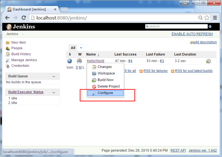 第1步- 轉(zhuǎn)到 Jenkins 儀表盤,然后點(diǎn)擊現(xiàn)有的HelloWorld項(xiàng)目,并選擇配置(Configure)選項(xiàng),如下圖所示: