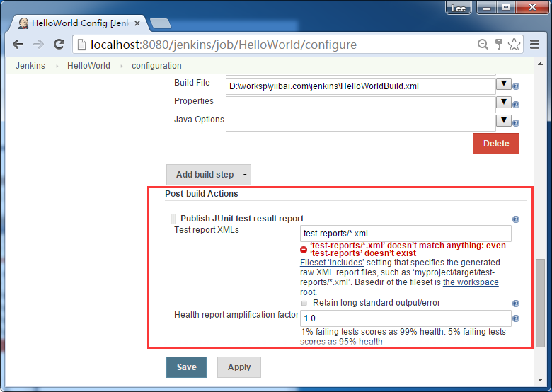 第6步 - 在測試報告XML,進(jìn)入如下圖所示的位置。確保報表是其在 Hello World 項(xiàng)目工作區(qū)創(chuàng)建的文件夾中?!?.xml” 主要是告訴Jenkins 這是由JUnit測試用例運(yùn)行產(chǎn)生的結(jié)果XML文件。然后被轉(zhuǎn)換成以后可以查看報告的 XML 文件。完成后,單擊在最后保存(Save)選項(xiàng)。