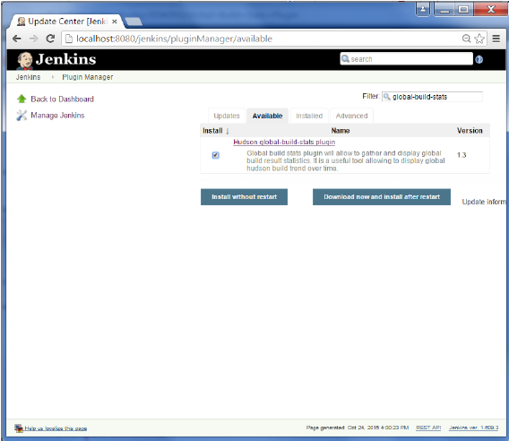 第3步 - 轉(zhuǎn)到可用(Available)選項卡,并搜索插件“Hudson global-build-stats plugin”并選擇“install without restart”。
