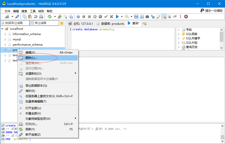可以使用管理工具(HeidiSQL)刪除數(shù)據(jù)庫。 選擇要刪除的數(shù)據(jù)庫,然后右鍵點擊目標(biāo)數(shù)據(jù)庫。這里假設(shè)要刪除一個名稱為"products"的數(shù)據(jù)庫。 會看到這樣的一個頁面: