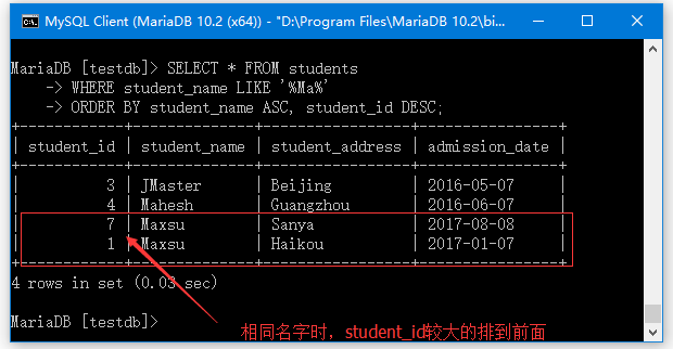 假設(shè)students表中有兩個(gè)人的名字是:Maxsu,我們希望先按student_name升序排序,在列的值相同時(shí),再按student_id降序排序,參考以下查詢語句 -