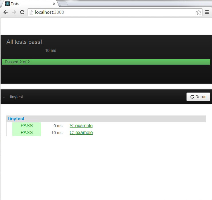 如果你打開 package-name-test.js, 你會看到默認的測試例子。我們將用這個例子來測試應用程序。開發(fā) Meteor 包時,你應該要寫寫自己的測試。
