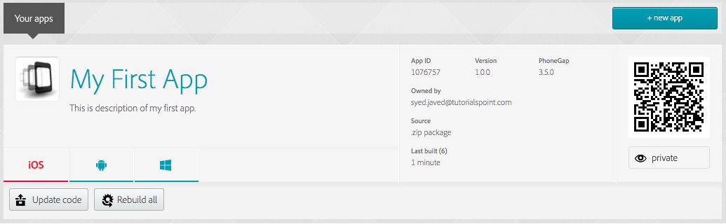 填寫(xiě)詳細(xì)信息,然后點(diǎn)擊注冊(cè)?,F(xiàn)在,可以登錄使用相同的用戶(hù)ID的PhoneGap。默認(rèn)情況下,這個(gè)頁(yè)面應(yīng)該由PhoneGap控制臺(tái)顯示如下: