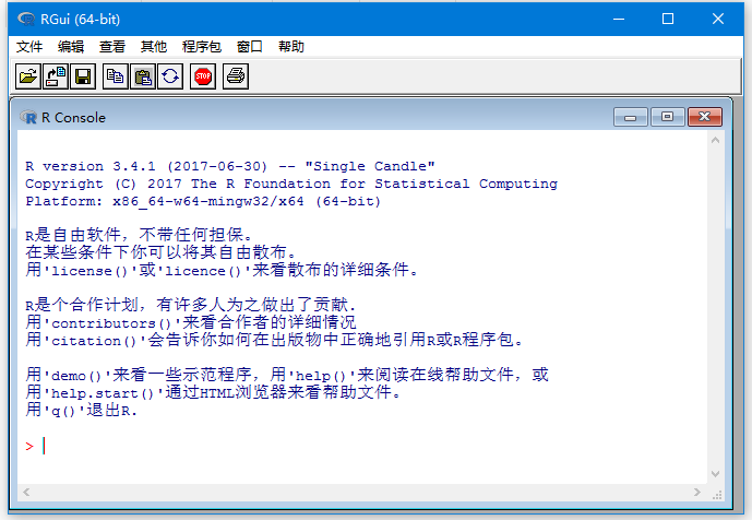 第七步: 安裝完成后,可以在Windows程序文件下的目錄結構“D:\Program Files\R\R-3.4.1\bin\x64\Rgui.exe”中找到運行該程序的圖標。單擊此圖標將顯示R-GUI,即R控制臺進行R編程。如下所示 -