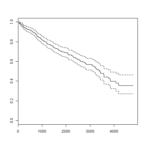 plot(survfit(Surv(pbc$time,pbc$status == 2)~1))