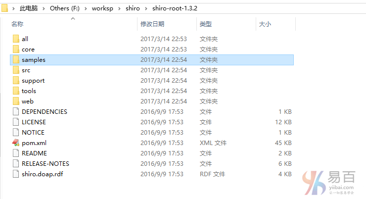 Source Code Distribution)。 在這個例子中使用1.3.2發(fā)布版本。這里我把把它下載并保存為:F:\worksp\shiro\shiro-root-1.3.2-source-release.zip。解壓縮源包,目錄如下所示: