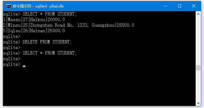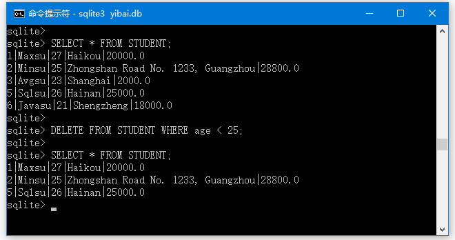 在執(zhí)行上面語句后,學(xué)生ID為4的記錄將被刪除; 可以使用SELECT語句檢查它: