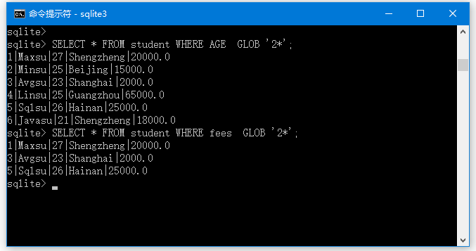 SQLite GLOB操作符通過使用通配符將模式表達(dá)式與文本值匹配, 當(dāng)搜索表達(dá)式與模式表達(dá)式匹配時(shí),GLOB運(yùn)算符將返回真,該值為:1。