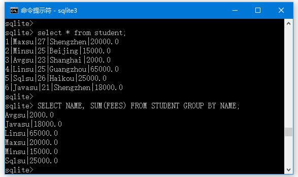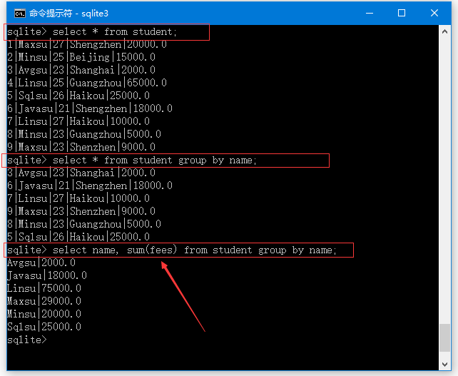 sqlite> SELECT NAME, SUM(FEES) AS total_fees FROM STUDENT GROUP BY NAME ORDER BY NAME DESC;
