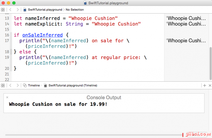 if onSaleInferred { println("\(nameInferred) on sale for \(priceInferred)!") } else { println("\(nameInferred) at regular price: \(priceInferred)!") }