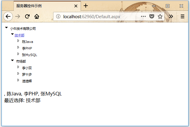 編寫幾行代碼,以確保選擇特定節(jié)點時,標簽控件顯示節(jié)點文本,文本框顯示其下的所有子節(jié)點(如果有的話)。 現(xiàn)在Default.aspx的代碼內(nèi)容如下: