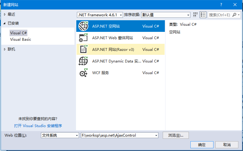 首先打開Visual Studio,創(chuàng)建一個名稱為:AjaxControl 的空ASP.NET網(wǎng)站項目,如下所示 -
