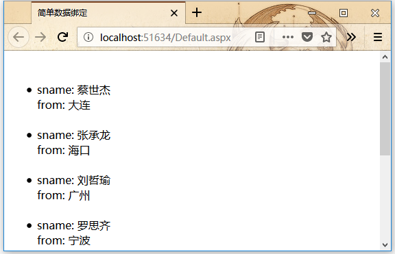 執(zhí)行應用程序時,請檢查整個sname和from列是否綁定到項目符號列表并顯示。