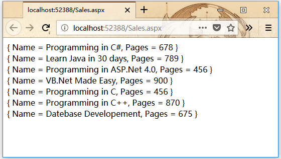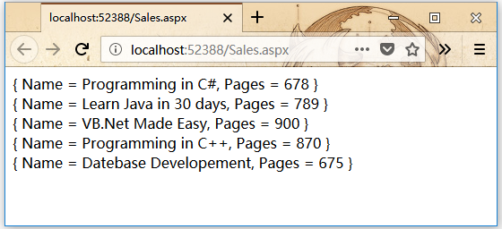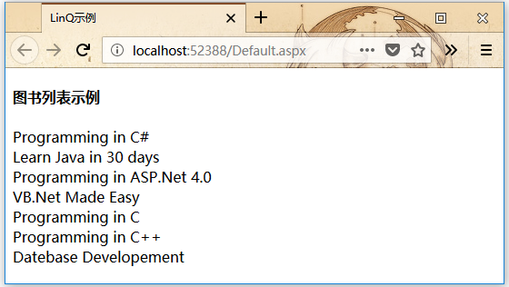 使用這個類的網(wǎng)頁有一個簡單的標簽控件,顯示書的標題。Page_Load事件創(chuàng)建書籍列表并通過使用LINQ查詢返回標題: