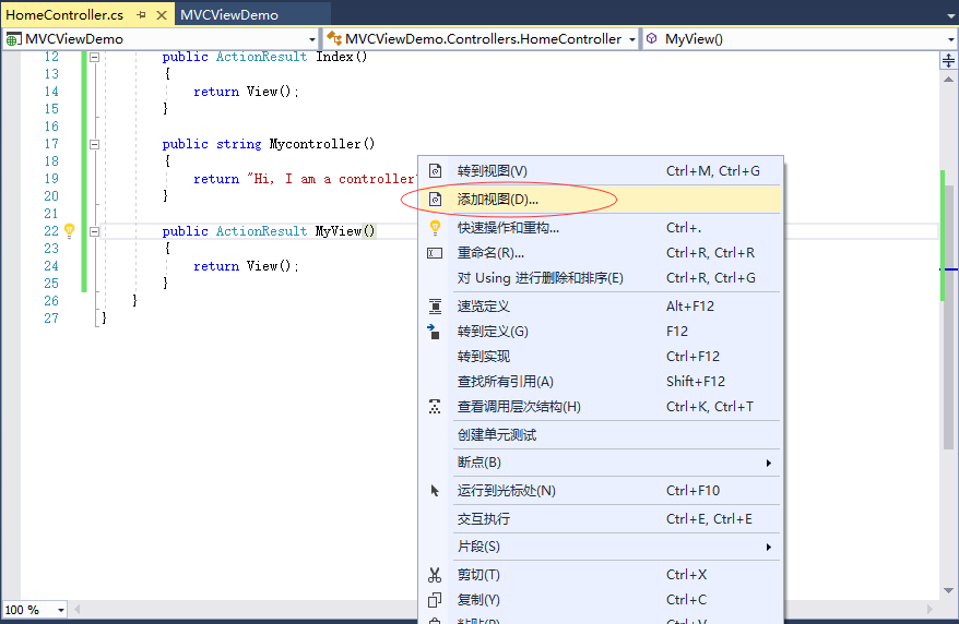 第2步 - 要添加一個(gè)視圖,右鍵單擊MyView動(dòng)作(方法)并選擇添加視圖。如下圖所示 -