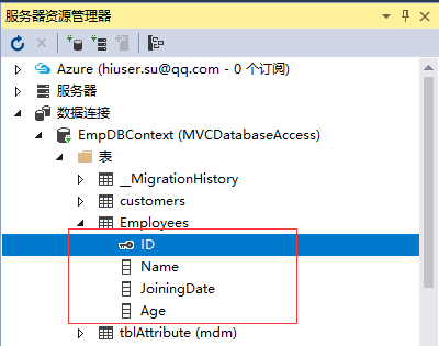 展開(kāi)這個(gè)數(shù)據(jù)庫(kù),會(huì)看到它有一個(gè)包含Employee模型類中的所有字段的表。