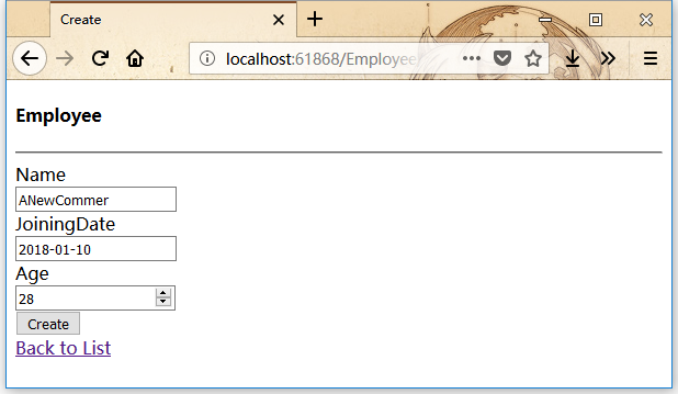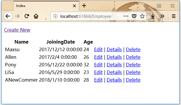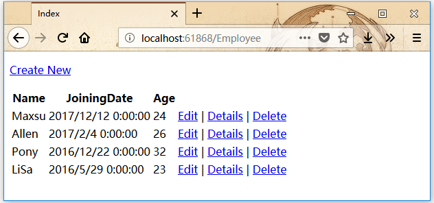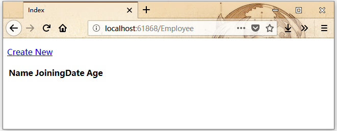 然后訪問(wèn)以下URL:http://localhost:61868/Employee運(yùn)行這個(gè)應(yīng)用程序。將看到以下輸出。