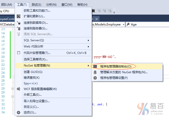 從 工具 -> NuGet程序包管理器 -> 程序包管理器控制臺(tái) 打開(kāi)程序包管理器控制臺(tái)窗口。