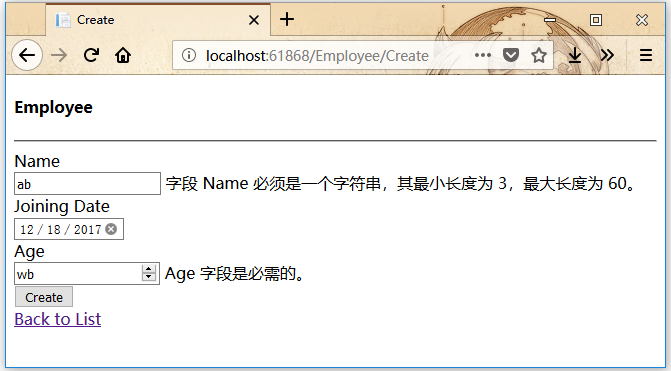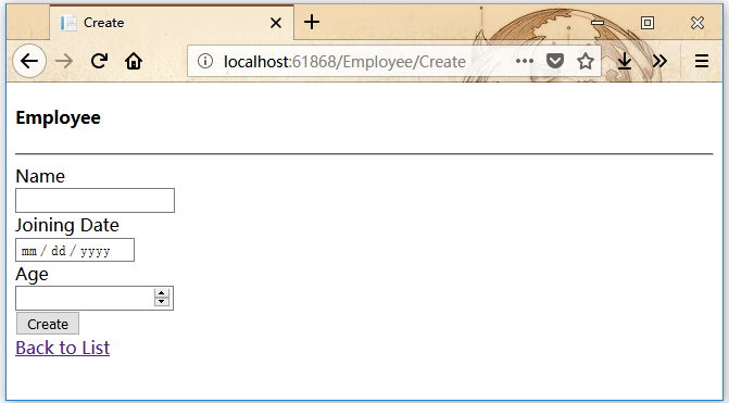 運(yùn)行此應(yīng)用程序并通過(guò)指定以下URL轉(zhuǎn)到創(chuàng)建視圖:http://localhost:63004/Employee/Create -