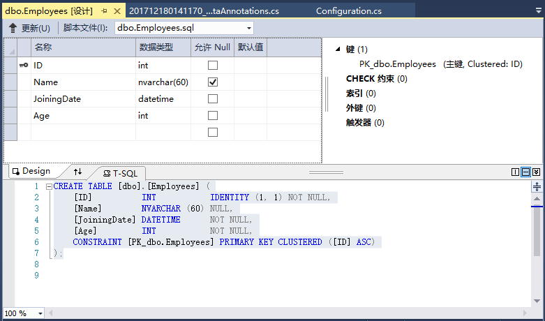 Visual Studio也將打開(kāi)從DbMIgration類(lèi)派生的類(lèi),可以在其中看到更新Up方法中的模式約束的代碼 -