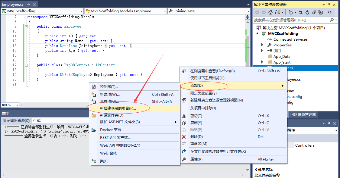 要添加腳手架,請右鍵單擊解決方案管理器中的Controllers文件夾,然后選擇:添加 -> 新建搭建基架項(xiàng)目 ,如下圖所示 -