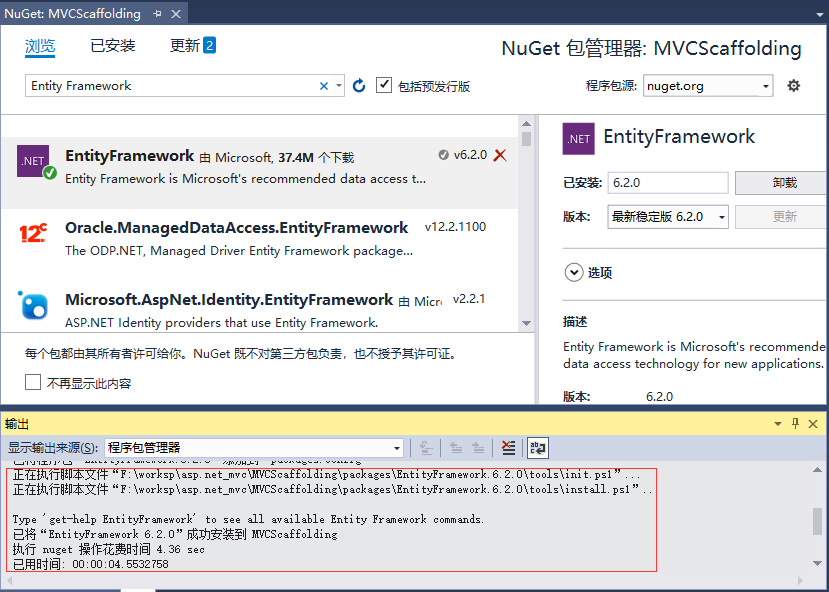 當(dāng)實(shí)體框架安裝成功后,可看到如上面的截圖所示的出窗口的消息。