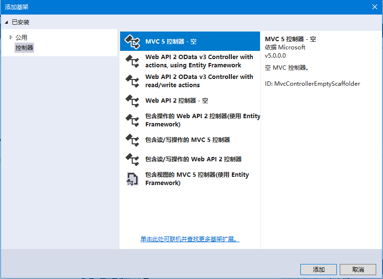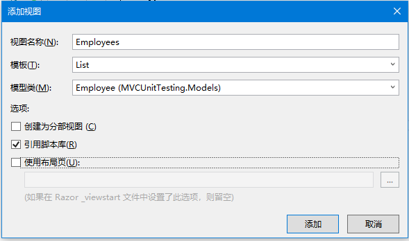 添加控制器對話框?qū)⒊霈F(xiàn)。將名稱設(shè)置為:EmployeeController,然后單擊“添加”按鈕。